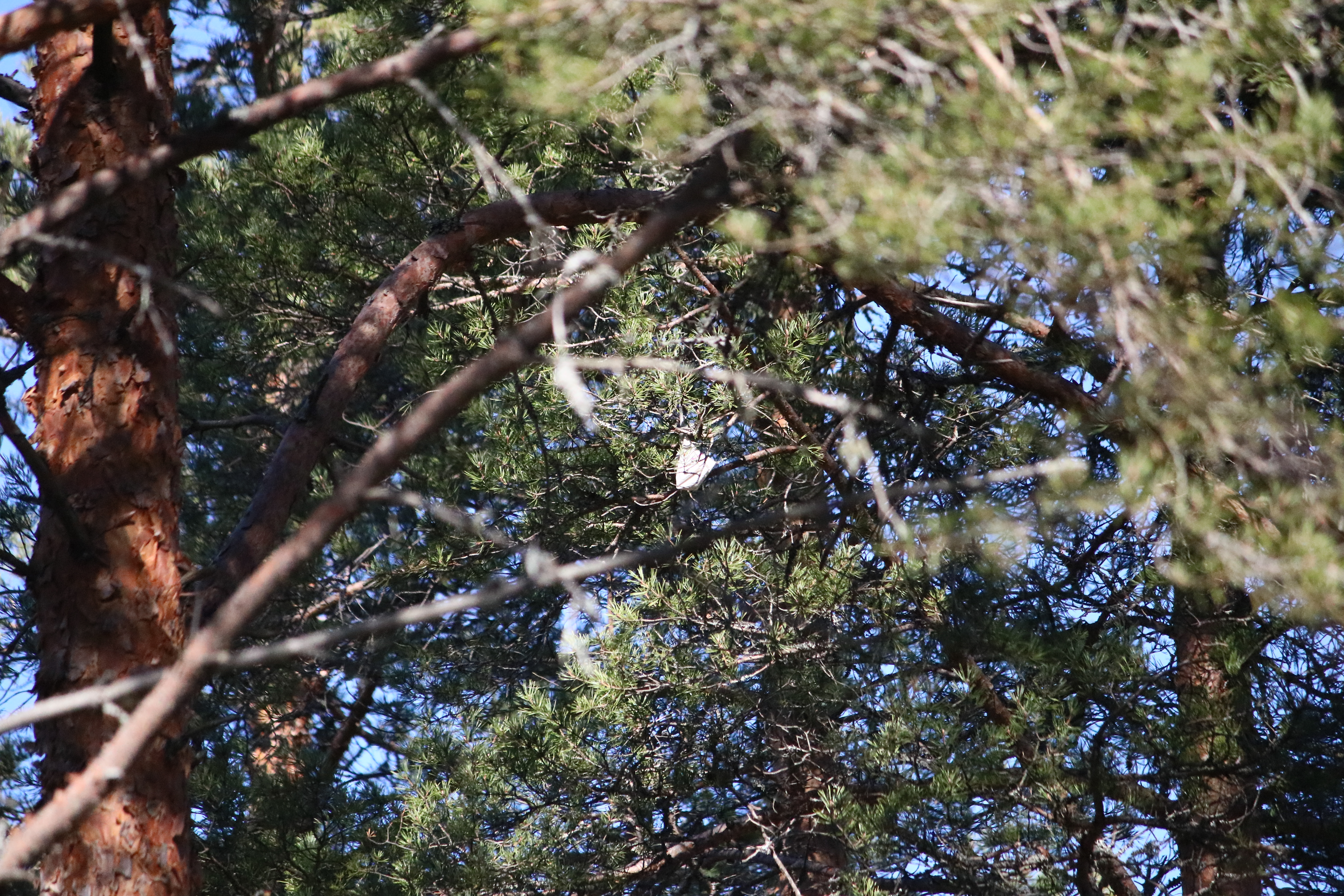 Kaakaotaukopaikalla yritin kameralla selvittää, mikä roska männyn yläoksilla roikkui, mutta olisi pitänyt mennä lähemmäs, kun ei tuosta vieläkään selvää saa. #